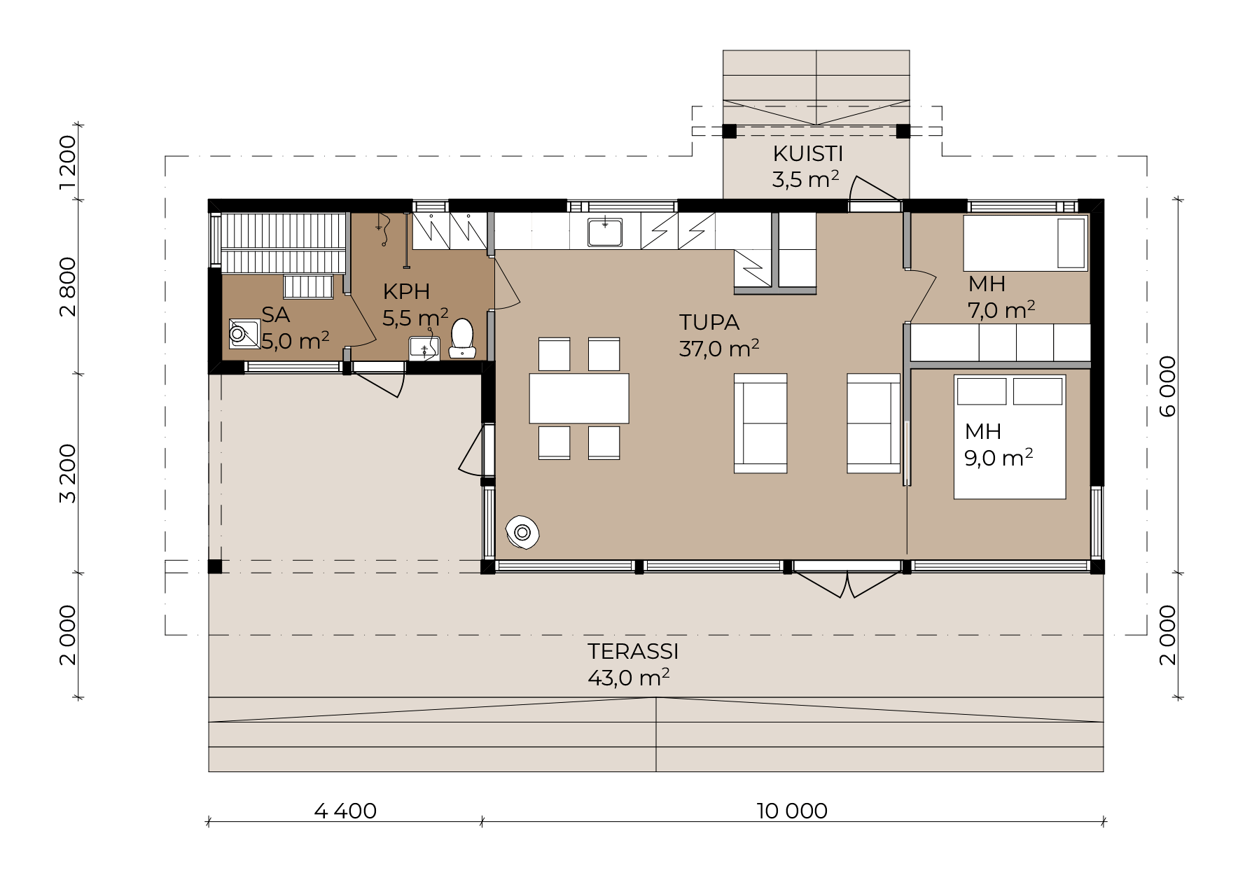 Raklinjade Jurmo presenterar stilfullt den förenklade skandinaviska designen. Grundligt planerad planlösning i kombination med stora fönsterytor och terrasser som släpper in den omgivande naturen och gör det till en del av interiören. Taktäckta terrassfronten kan användas som grillpunkt eller som sommarkök.